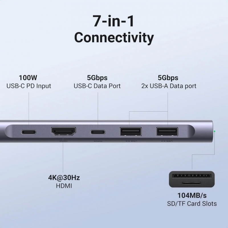 - Bộ chuyển Type C to HDMI 4k@30Hz + 2 x USB 3.0 + USB-C + SD&TF + PD Ugreen 15214 : thêm cổng USB-C trên máy tính xách tay của bạn với cổng dữ liệu USB-C & USB-A 5Gbps, HDMI 4K, Power Delivery 100W và đầu đọc thẻ SD/Micro SD.